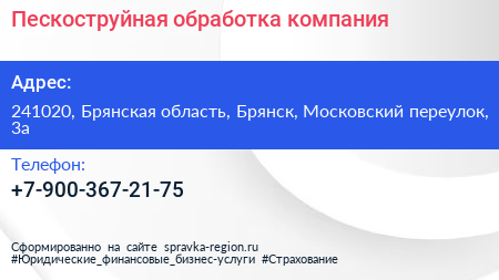 Пескоструйная обработка, компания по адресу 241020, Брянская область, Брянск, Московский переулок, 3а в дальнейшем Организация, размещена в следующих категориях: