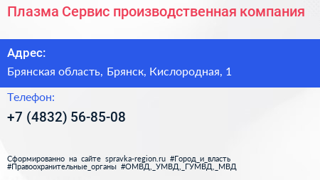 Плазма Сервис, производственная компания по адресу Брянская область, Брянск, Кислородная, 1 в дальнейшем Организация, размещена в следующих категориях: