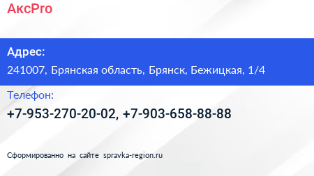 АксPro по адресу 241007, Брянская область, Брянск, Бежицкая, 1/4 в дальнейшем Организация, размещена в следующих категориях: