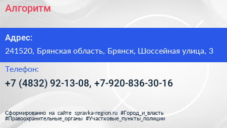 Алгоритм по адресу 241520, Брянская область, Брянск, Шоссейная улица, 3 в дальнейшем Организация, размещена в следующих категориях: