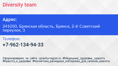 Diversity.team по адресу 241050, Брянская область, Брянск, 2-й Советский переулок, 3 в дальнейшем Организация, размещена в следующих категориях: