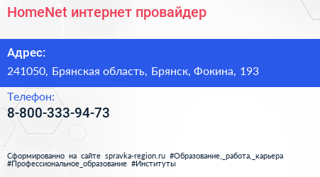 HomeNet, интернет-провайдер по адресу 241050, Брянская область, Брянск, Фокина, 193 в дальнейшем Организация, размещена в следующих категориях: