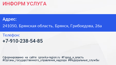 ИНФОРМ.УСЛУГА по адресу 241050, Брянская область, Брянск, Грибоедова, 26а в дальнейшем Организация, размещена в следующих категориях: