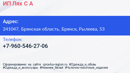 ИП Лях С.А. по адресу 241047, Брянская область, Брянск, Рылеева, 53 в дальнейшем Организация, размещена в следующих категориях: