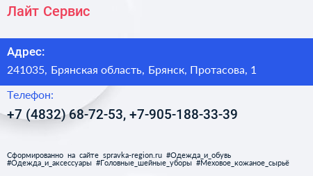Лайт-Сервис по адресу 241035, Брянская область, Брянск, Протасова, 1 в дальнейшем Организация, размещена в следующих категориях: