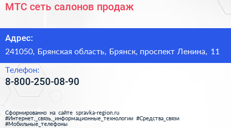 МТС, сеть салонов продаж по адресу 241050, Брянская область, Брянск, проспект Ленина, 11 в дальнейшем Организация, размещена в следующих категориях:
