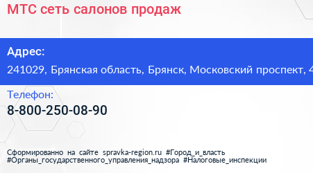 МТС, сеть салонов продаж по адресу 241029, Брянская область, Брянск, Московский проспект, 4 в дальнейшем Организация, размещена в следующих категориях: