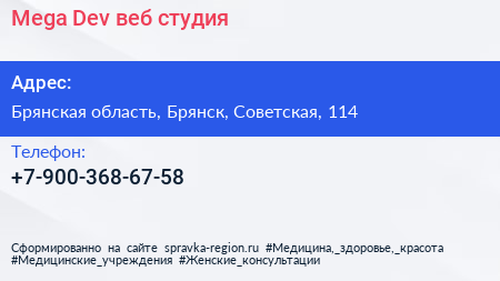 Mega-Dev, веб-студия по адресу Брянская область, Брянск, Советская, 114 в дальнейшем Организация, размещена в следующих категориях: