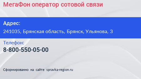 МегаФон, оператор сотовой связи по адресу 241035, Брянская область, Брянск, Ульянова, 3 в дальнейшем Организация, размещена в следующих категориях: