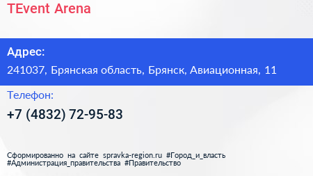 TEvent Arena по адресу 241037, Брянская область, Брянск, Авиационная, 11 в дальнейшем Организация, размещена в следующих категориях: