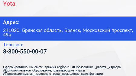 Yota по адресу 241020, Брянская область, Брянск, Московский проспект, 49а в дальнейшем Организация, размещена в следующих категориях: