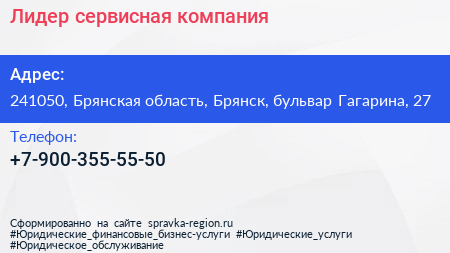 Лидер, сервисная компания по адресу 241050, Брянская область, Брянск, бульвар Гагарина, 27 в дальнейшем Организация, размещена в следующих категориях: