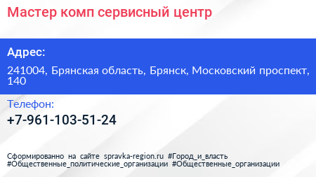 Мастер-комп, сервисный центр по адресу 241004, Брянская область, Брянск, Московский проспект, 140 в дальнейшем Организация, размещена в следующих категориях: