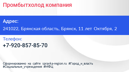 Промбытхолод, компания по адресу 241022, Брянская область, Брянск, 11 лет Октября, 2 в дальнейшем Организация, размещена в следующих категориях: