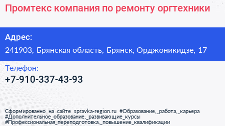 Промтекс, компания по ремонту оргтехники по адресу 241903, Брянская область, Брянск, Орджоникидзе, 17 в дальнейшем Организация, размещена в следующих категориях: