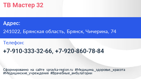 ТВ Мастер 32 по адресу 241022, Брянская область, Брянск, Чичерина, 74 в дальнейшем Организация, размещена в следующих категориях: