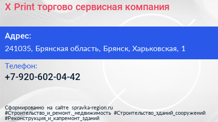 X-Print, торгово-сервисная компания по адресу 241035, Брянская область, Брянск, Харьковская, 1 в дальнейшем Организация, размещена в следующих категориях: