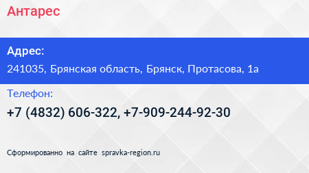 Антарес по адресу 241035, Брянская область, Брянск, Протасова, 1а в дальнейшем Организация, размещена в следующих категориях: