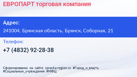ЕВРОПАРТ, торговая компания по адресу 241004, Брянская область, Брянск, Соборная, 21 в дальнейшем Организация, размещена в следующих категориях: