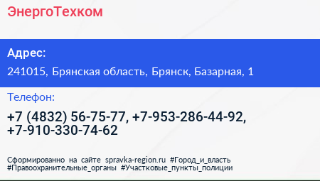 ЭнергоТехком по адресу 241015, Брянская область, Брянск, Базарная, 1 в дальнейшем Организация, размещена в следующих категориях: