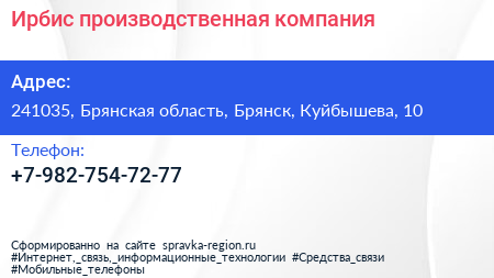 Ирбис, производственная компания по адресу 241035, Брянская область, Брянск, Куйбышева, 10 в дальнейшем Организация, размещена в следующих категориях: