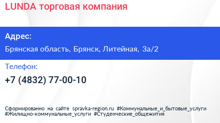 LUNDA, торговая компания по адресу Брянская область, Брянск, Литейная, 3а/2 в дальнейшем Организация, размещена в следующих категориях: