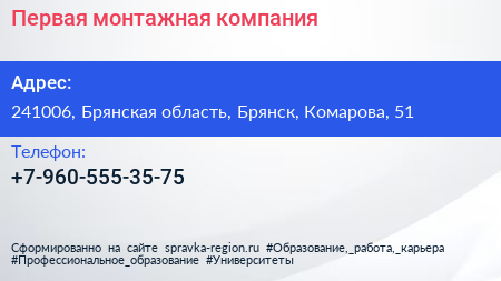 Первая монтажная компания по адресу 241006, Брянская область, Брянск, Комарова, 51 в дальнейшем Организация, размещена в следующих категориях: