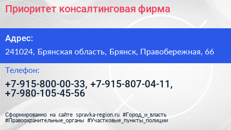 Приоритет, консалтинговая фирма по адресу 241024, Брянская область, Брянск, Правобережная, 66 в дальнейшем Организация, размещена в следующих категориях: