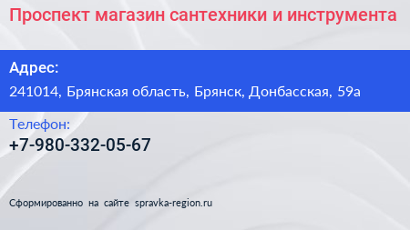 Проспект, магазин сантехники и инструмента по адресу 241014, Брянская область, Брянск, Донбасская, 59а в дальнейшем Организация, размещена в следующих категориях: