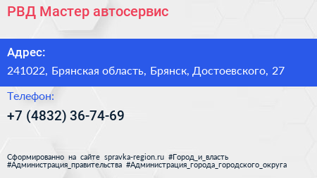 РВД Мастер, автосервис по адресу 241022, Брянская область, Брянск, Достоевского, 27 в дальнейшем Организация, размещена в следующих категориях: