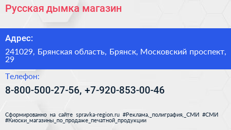 Русская дымка, магазин по адресу 241029, Брянская область, Брянск, Московский проспект, 29 в дальнейшем Организация, размещена в следующих категориях: