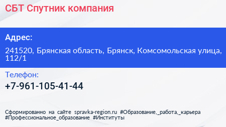 СБТ Спутник, компания по адресу 241520, Брянская область, Брянск, Комсомольская улица, 112/1 в дальнейшем Организация, размещена в следующих категориях: