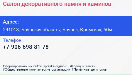 Салон декоративного камня и каминов по адресу 241013, Брянская область, Брянск, Кромская, 50м в дальнейшем Организация, размещена в следующих категориях: