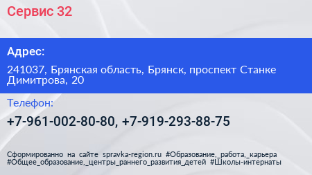 Сервис 32 по адресу 241037, Брянская область, Брянск, проспект Станке Димитрова, 20 в дальнейшем Организация, размещена в следующих категориях: