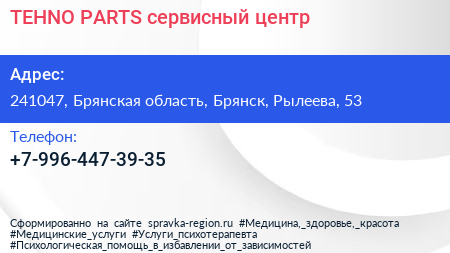 TEHNO PARTS, сервисный центр по адресу 241047, Брянская область, Брянск, Рылеева, 53 в дальнейшем Организация, размещена в следующих категориях:
