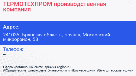 ТЕРМОТЕХПРОМ, производственная компания по адресу 241035, Брянская область, Брянск, Московский микрорайон, 58 в дальнейшем Организация, размещена в следующих категориях: