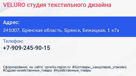 VELURO, студия текстильного дизайна по адресу 241007, Брянская область, Брянск, Бежицкая, 1 к7а в дальнейшем Организация, размещена в следующих категориях: