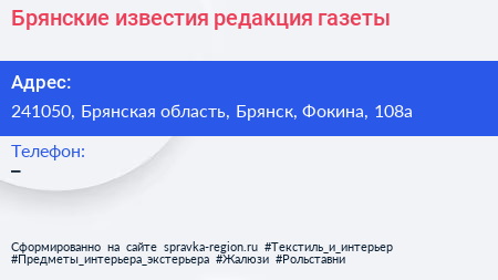 Брянские известия, редакция газеты по адресу 241050, Брянская область, Брянск, Фокина, 108а в дальнейшем Организация, размещена в следующих категориях: