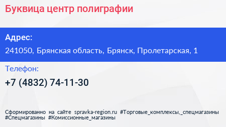Буквица, центр полиграфии по адресу 241050, Брянская область, Брянск, Пролетарская, 1 в дальнейшем Организация, размещена в следующих категориях: