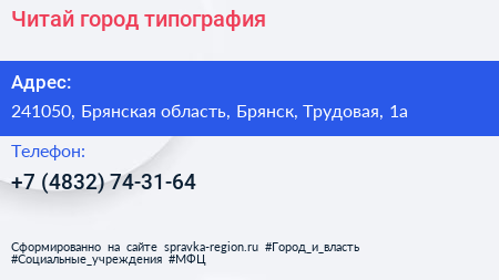 Читай-город, типография по адресу 241050, Брянская область, Брянск, Трудовая, 1а в дальнейшем Организация, размещена в следующих категориях: