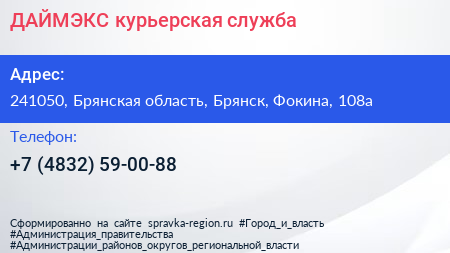 ДАЙМЭКС, курьерская служба по адресу 241050, Брянская область, Брянск, Фокина, 108а в дальнейшем Организация, размещена в следующих категориях: