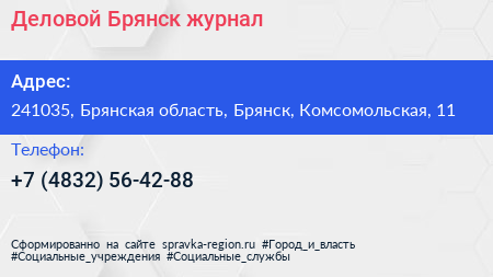 Деловой Брянск, журнал по адресу 241035, Брянская область, Брянск, Комсомольская, 11 в дальнейшем Организация, размещена в следующих категориях: