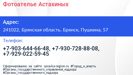 Фотоателье Астахиных по адресу 241022, Брянская область, Брянск, Пушкина, 57 в дальнейшем Организация, размещена в следующих категориях: