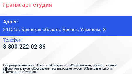 Гранж, арт-студия по адресу 241015, Брянская область, Брянск, Ульянова, 8 в дальнейшем Организация, размещена в следующих категориях: