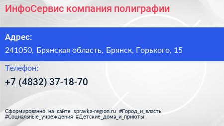 ИнфоСервис, компания полиграфии по адресу 241050, Брянская область, Брянск, Горького, 15 в дальнейшем Организация, размещена в следующих категориях: