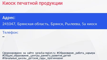 Киоск печатной продукции по адресу 241047, Брянская область, Брянск, Рылеева, 5а киоск в дальнейшем Организация, размещена в следующих категориях: