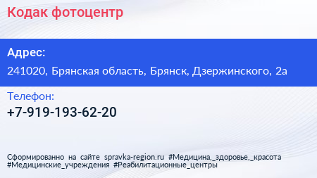 Кодак, фотоцентр по адресу 241020, Брянская область, Брянск, Дзержинского, 2а в дальнейшем Организация, размещена в следующих категориях: