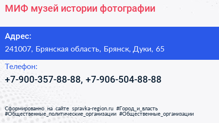 МИФ, музей истории фотографии по адресу 241007, Брянская область, Брянск, Дуки, 65 в дальнейшем Организация, размещена в следующих категориях: