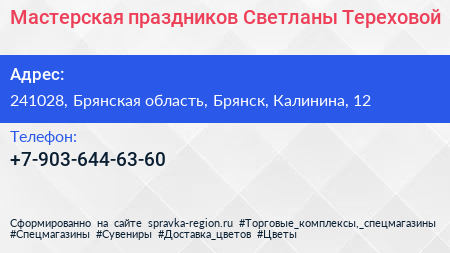 Мастерская праздников Светланы Тереховой по адресу 241028, Брянская область, Брянск, Калинина, 12 в дальнейшем Организация, размещена в следующих категориях: