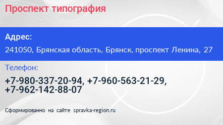 Проспект, типография по адресу 241050, Брянская область, Брянск, проспект Ленина, 27 в дальнейшем Организация, размещена в следующих категориях: